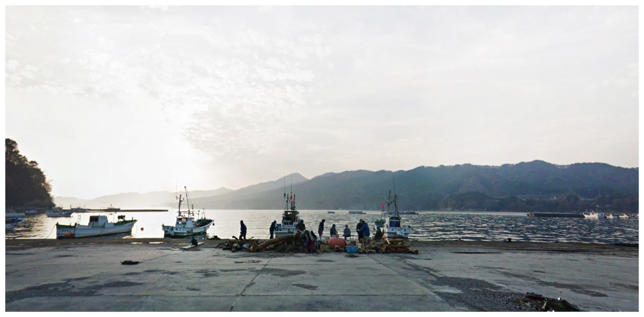introduction | images: nets | floats | a crow | piles of what was | tires gathering | bagging | whaleboy | stones | a butterfly | mickey mouse pillars | sweeping man | asian symphony | fisherman gathering | rubble | worker | a small boat | zen "fishermen gathering" print + shipping print + USA Shipping $31.00 USD print + International Shipping $40.00 USD